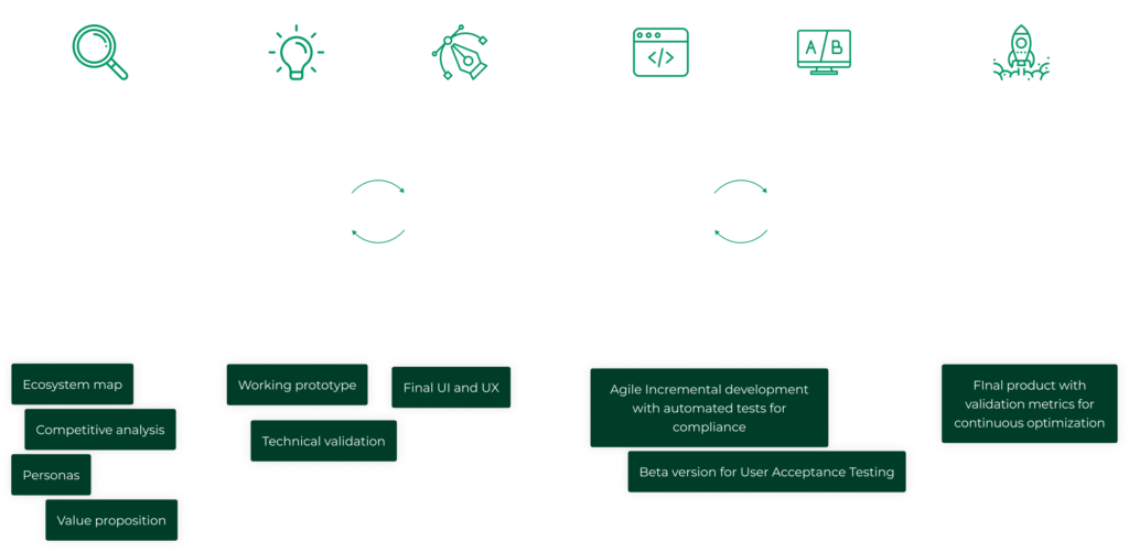 Our UI/UX design process is based on the design thinking methodology, which allows us to be flexible, adapting to almost any project type and collaboration model. While each UX/UI design engagement is unique, we always go through the following key phases:
